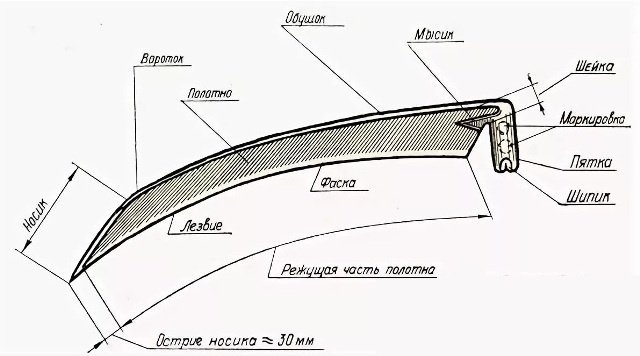 Модели различаются длиной ножа и степенью изгиба. Эти особенности учитываются при выборе косы в зависимости от ее прямого назначения.