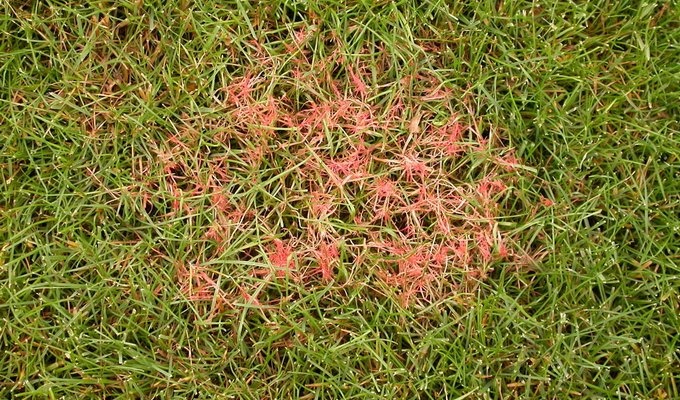 Еще одна распространенная болезнь газонов - красная нить. При поражении этим заболеванием на растениях появляются удлиненные красные споры. Постепенно на газоне образуются островки сухой травы, на которых хорошо видны красноватые пятна. Если вы заметили признаки заболевания, обработайте растения карбендазимом или другим системным фунгицидом. Рыхление и аэрация газона, своевременное внесение удобрений и умеренная (не короткая) стрижка - хорошая профилактика красной нити.