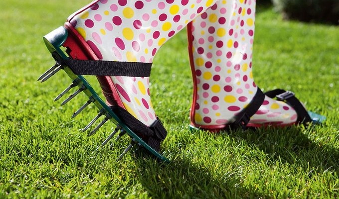Сделать аэратор для ног для небольшого газона можно своими руками. Отрежьте два куска дерева или фанеры по подошве обуви, вкрутите длинные шурупы или забейте гвозди. На обуви эти накладки можно прикрепить ремнями или резиновыми кольцами.